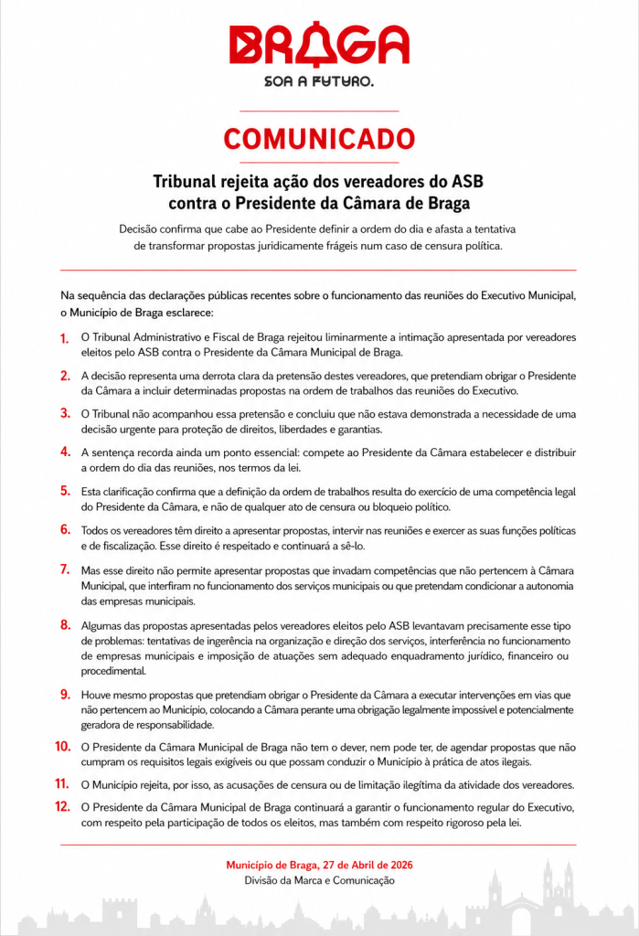 Após o final da reunião, a guerra transferiu-se para o papel. O Município de Braga emitiu um comunicado a declarar a vitória judicial, frisando que o tribunal confirmou a competência legal do presidente para estabelecer a ordem do dia, e acusando o ASB de tentar transformar “propostas juridicamente frágeis num caso de censura política”