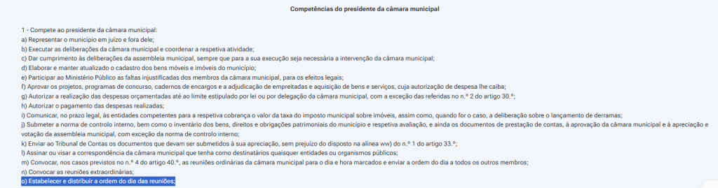 Para deitar por terra a tentativa de ingerência imediata na construção da agenda do Executivo, a sentença foi procurar suporte direto à Lei n.º 75/2013 (Regime Jurídico das Autarquias Locais). A juíza citou a alínea o) do n.º 1 do artigo 35.º para recordar, de forma expressa, que é competência legal do presidente da câmara “estabelecer e distribuir a ordem do dia das reuniões”.